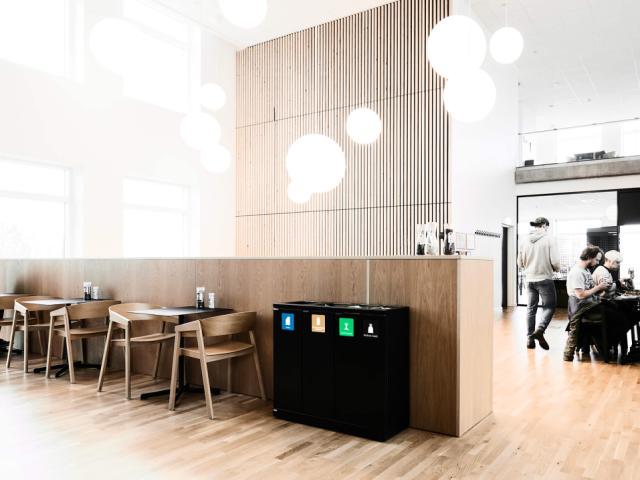 Det resulterte i en fleksibel innendørs løsning, som totalt sett består av Model 950 med fire beholdere og Model 870 med tre beholdere, i sort lakk. Til dette valgte de å kjøpe 65 liters-innerbeholdere og med selvklebende piktogrammer i farger. Løsningen er implementert i alle korridorer, i møterommene og ved kaffemaskinene, og erstatter mange avfallsbeholdere som i dag er fjernet fra Agro Food Park.