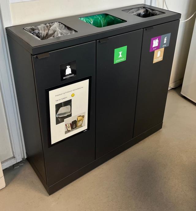 Avfallsløsningen er nøye utvalgt for å dekke våre ulike typer avfall og samtidig med fokus på at de skal være lette for renholdspersonalet å håndtere, slik at de unngår tunge løft.